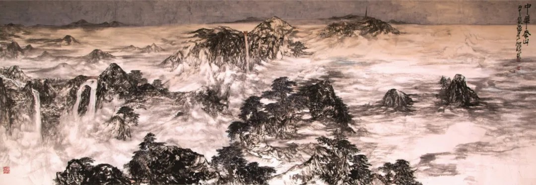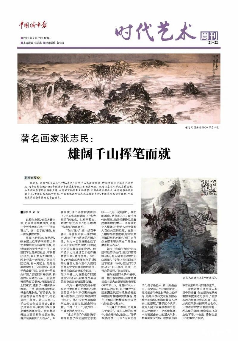 在张志民的众多作品中,有一幅作品的出镜率颇高,这便是悬挂在人民大会堂新闻发布厅的《中华泰山》。这幅800cm×300cm的巨制,将庄重大气的国家殿堂风范与浪漫诗意的中国画写意精神完美融合,是充分体现时代精神和中国文化特色的代表之作。